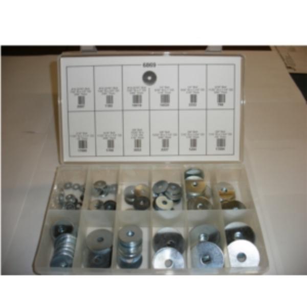 Auveco 6869 Custom Fender Washer Assortment in 7" x 11" poly box. Twelve different size Fender Washers all labeled with size, picture and part number for easy refill orders. Sufficient for any size repair facility.