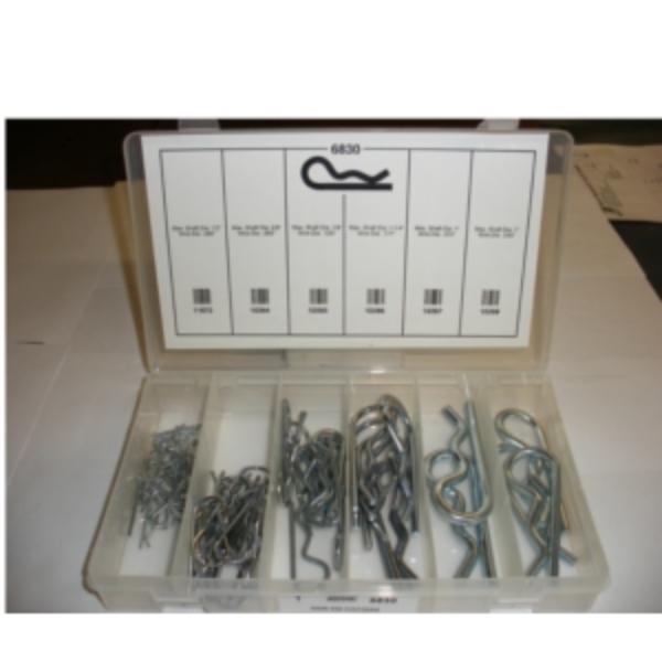 Assortment of six different size Hair Pins in clear plastic box all labeled with size, picture and part number for easy refill orders. Most popular sizes included for lawn equipment to heavy equipment. Sufficient for any size repair facility.